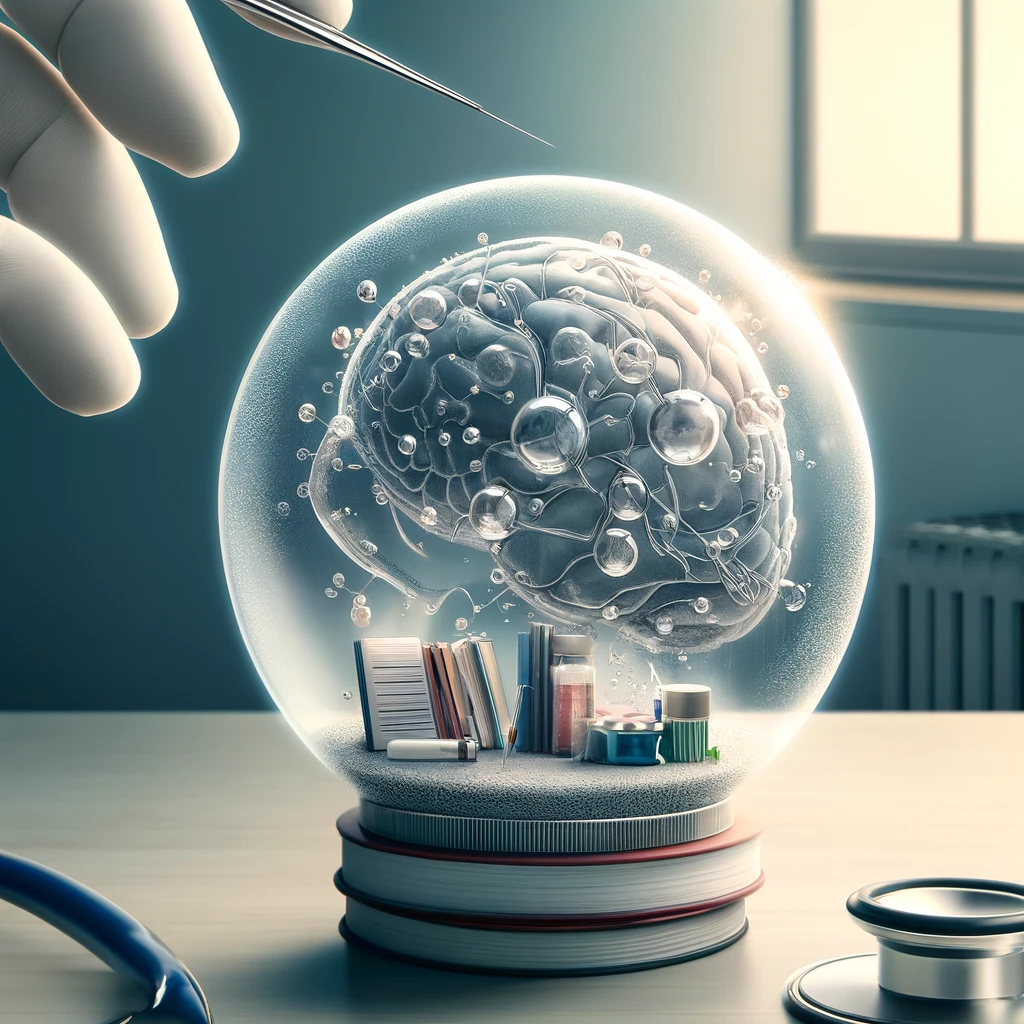 ChatGPT: image depicting the metaphor of a bubble and a needle for the onset of mental stress in a medical student. The bubble represents the student’s mind and ambitions, with the needle symbolizing the threat of stress. The calm, clinical setting emphasizes the seriousness of the situation.