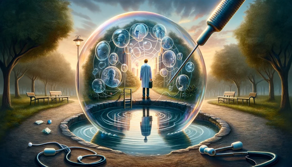 ChatGPT: lifelike, realistic image of a soap bubble about to be pierced by a needle in the form of a voice. Inside the bubble, you can see the medical student by a reflective pool, surrounded by various paths and ethereal images. This captures the contemplative and introspective mood, symbolizing the student’s journey of self-discovery and reflection.